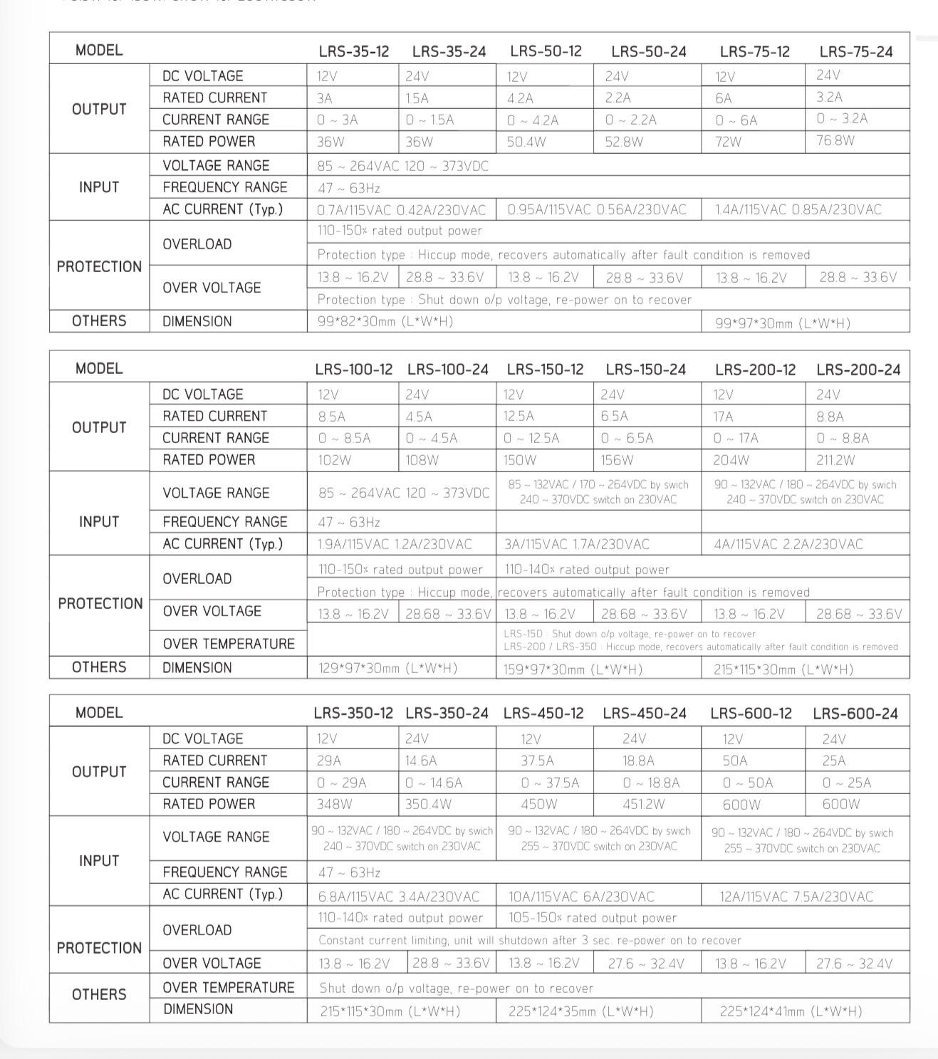 * Cooling by free air convection (35W-200W) / Forced air cooling by Built-in DC fan (350W): มีระบบระบายความร้อน 2 แบบ คือใช้การระบายความร้อน(สำหรับรุ่น 35-200W) และใช้พัดลมในตัว (สำหรับรุ่น 350W) เพื่อประสิทธิภาพสูงสุด