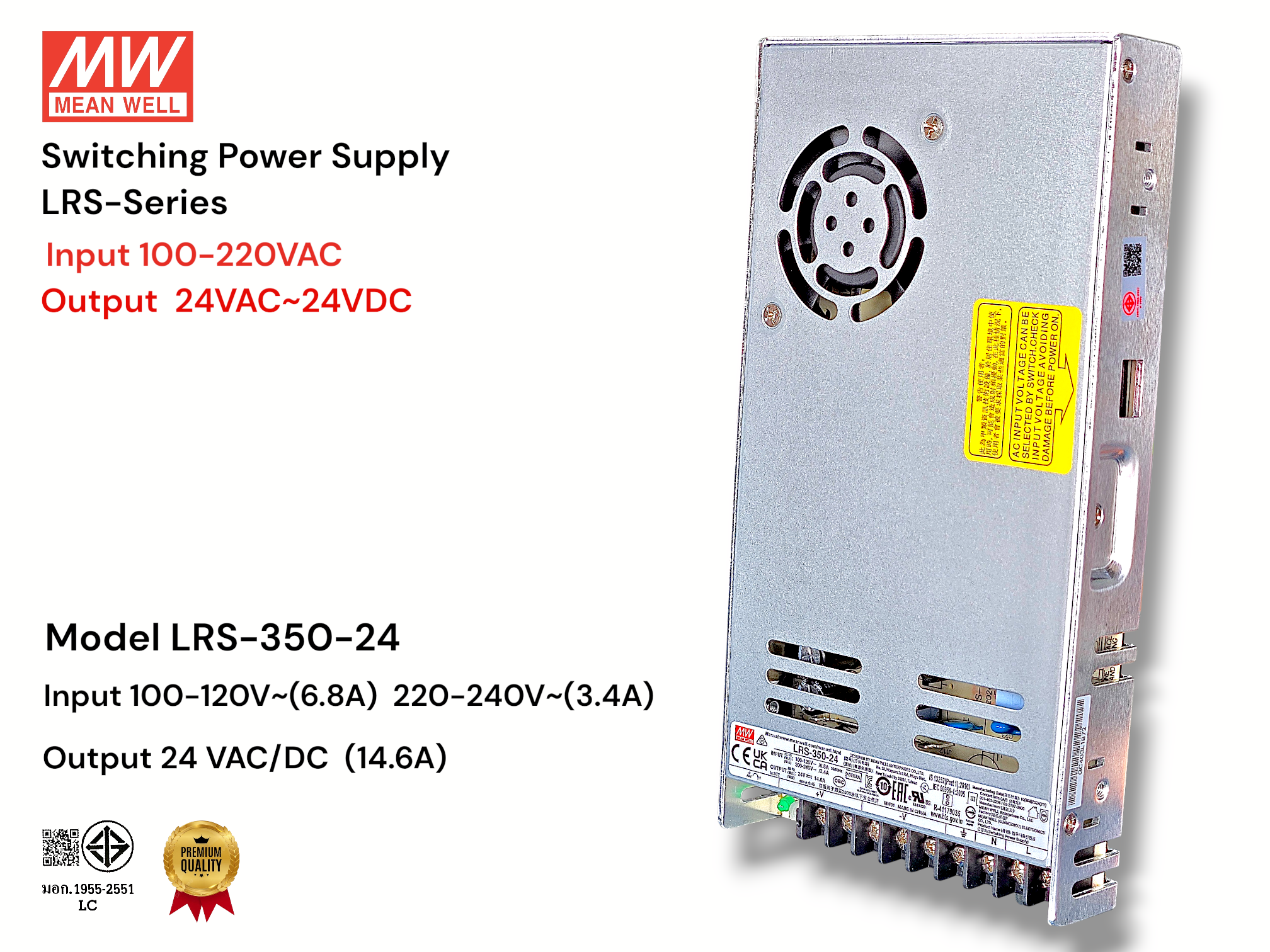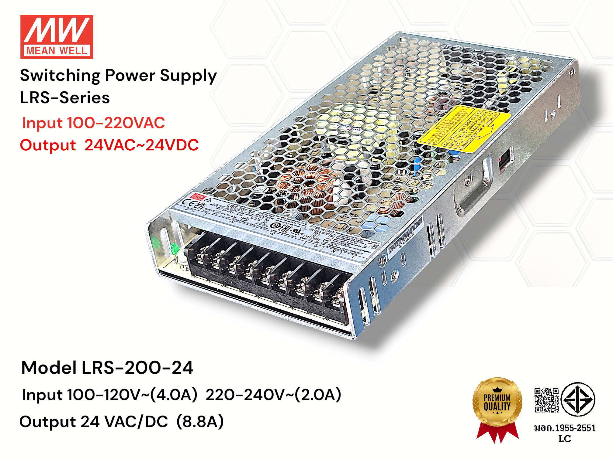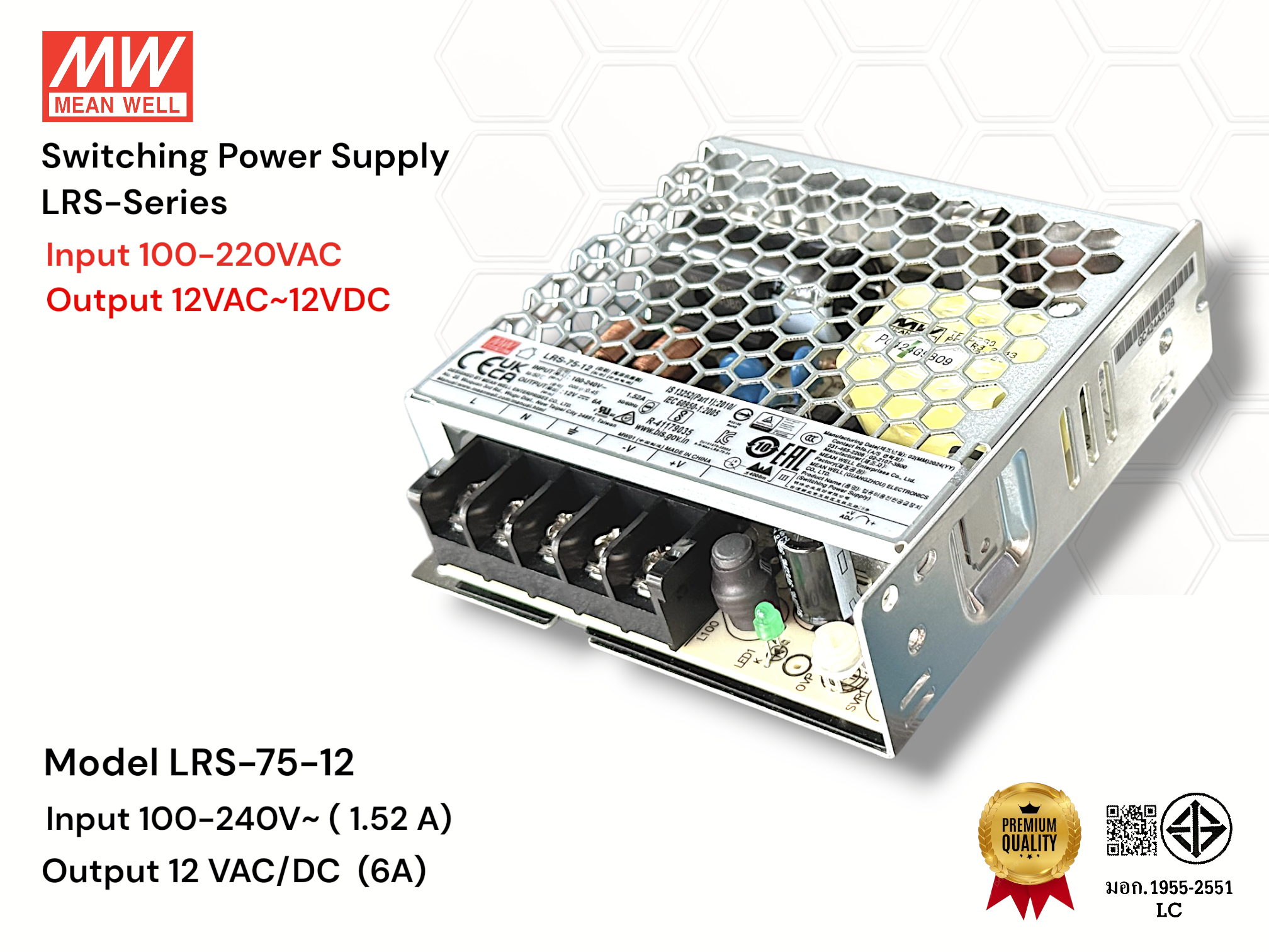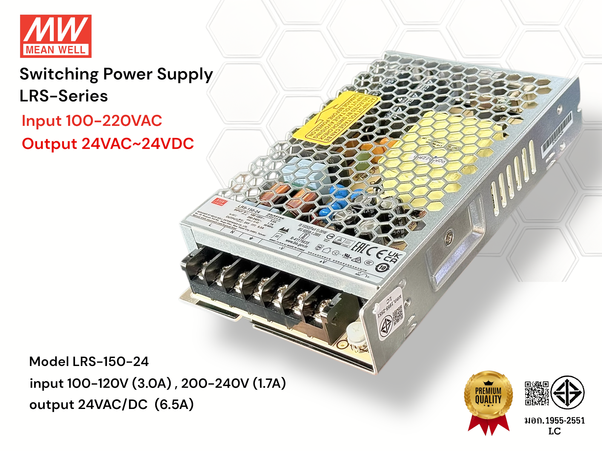Mean Well LRS- Series Switching Power Supply อุปกรณ์ที่แปลงไฟฟ้ากระแสสลับ (AC) แรงสูง ให้เป็นไฟฟ้ากระแสตรง (DC) แรงดันต่ำ โดยใช้การสวิตช์สัญญาณความถี่สูง ทำให้มี ประสิทธิภาพสูง ขนาดเล็ก และน้ำหนักเบา ทนทานต่อแรงดันไฟกระชาก 300VAC นาน 5 วินาที, พร้อมป้องกัน Short Circuit / Overload / Over Voltag