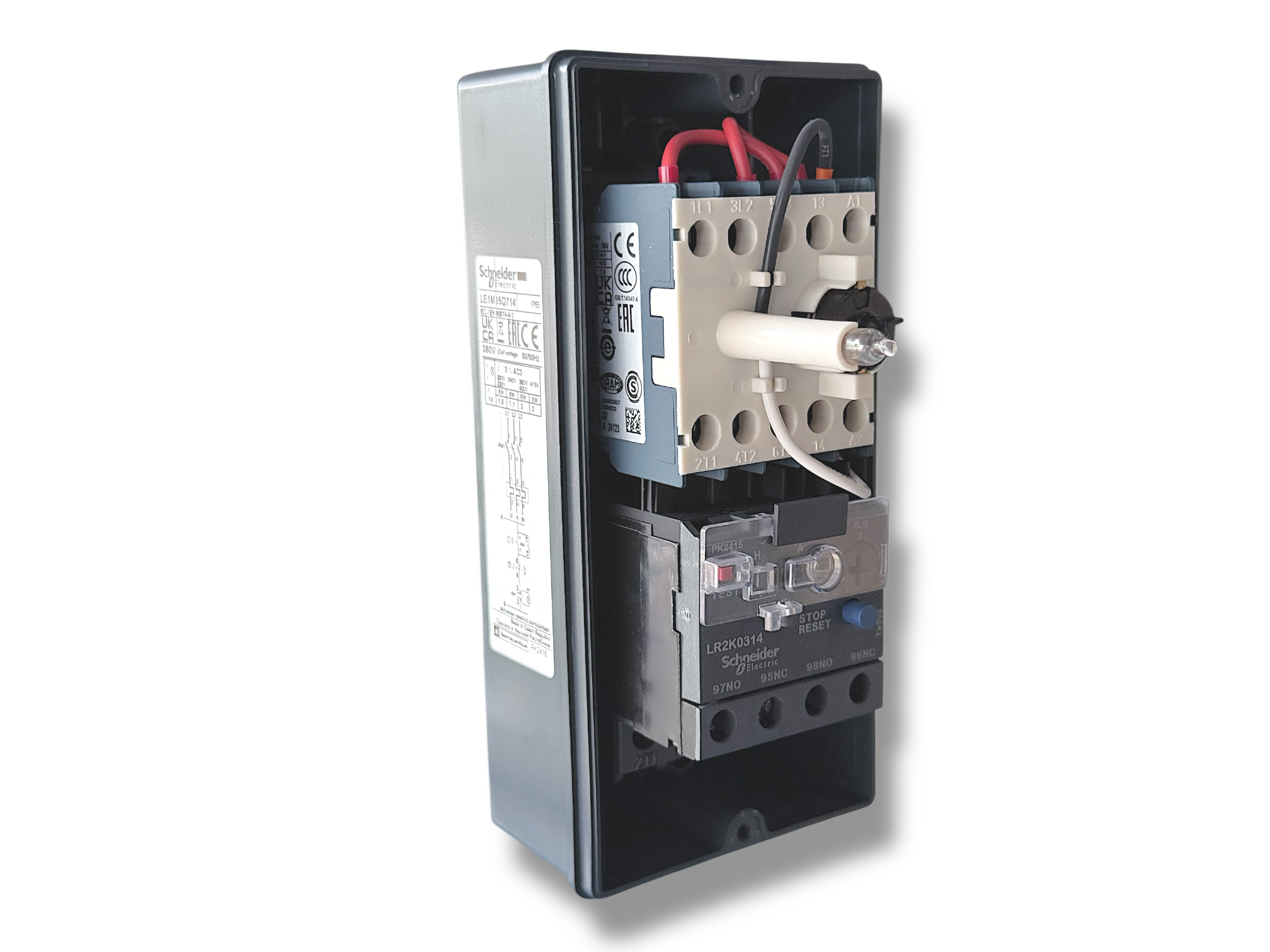 กล่องสตาร์ท Schneider LE1-M35Q7 (LE1-M35Q705–LE1-M35Q722) สำหรับมอเตอร์ 3 เฟส 380V IP65 ปุ่ม Start/Stop พร้อมไฟสถานะแสดงการทำงาน, รีเลย์โอเวอร์โหลดปรับได้ เลือกรุ่นตาม kW/ช่วงแอมป์ที่ต้องการ