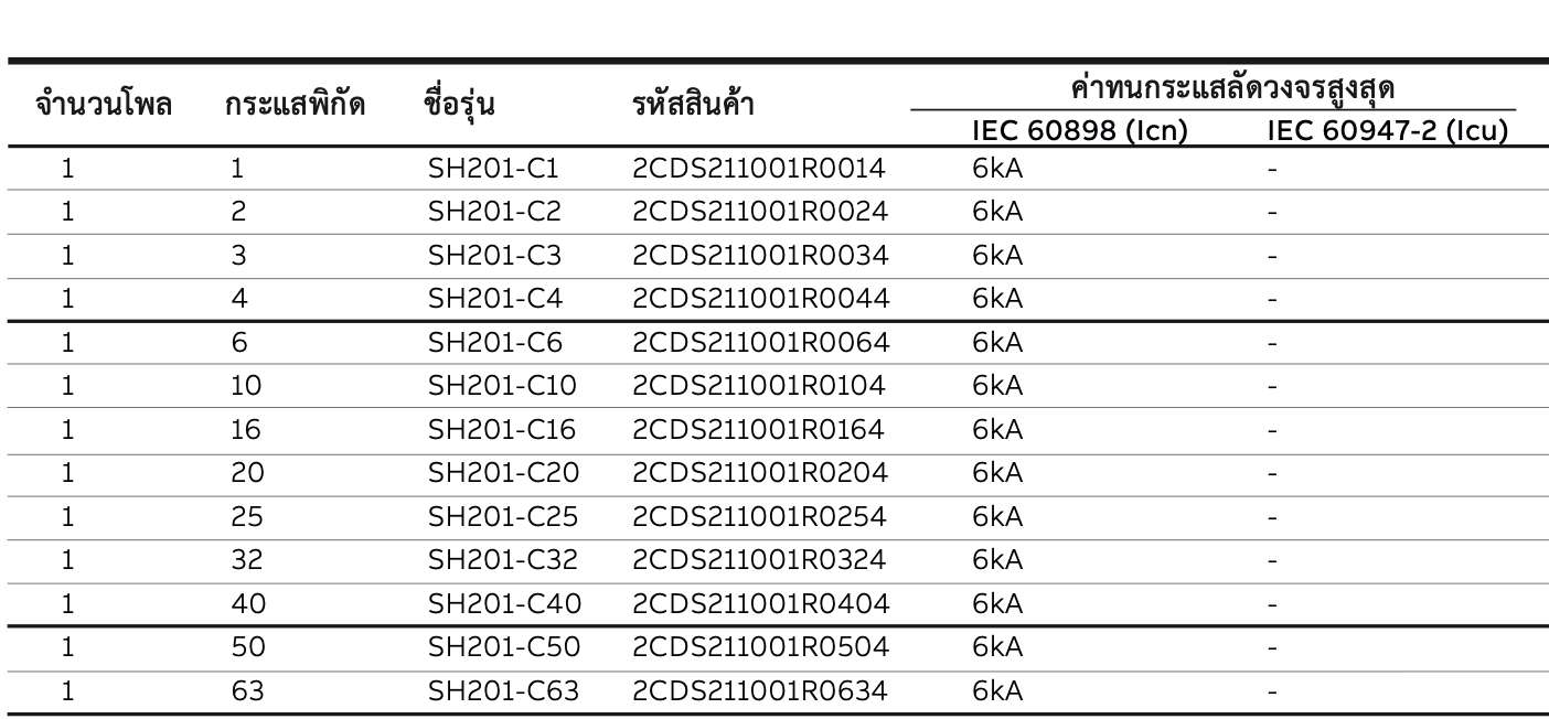 พิกัดทนกระแสลัดวงจร (Icn)6kA (ตามมาตรฐาน IEC 60898)